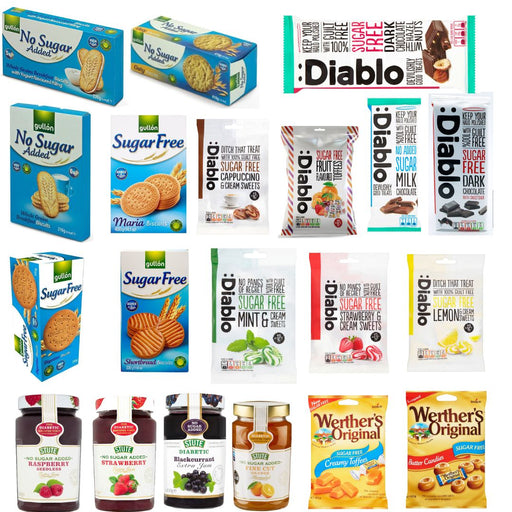 Deluxe Sugar Free Snack Box with 12 Selected Delights [Cookies, Chocolates, Biscuits, Jams and Sweets]